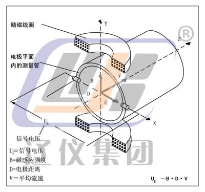 電磁流量計所依據的基本原理是法拉第電磁感應定律,導體在磁場中做切割磁力線運動時,導體內將產生感應電動勢。將該原理應用于測量管內流動的導電液體,并且流體流動的方向與磁場方向垂直(見圖)。流體中產生的感應電動勢被位于管子徑向兩端的一對電極檢測到,該感應電動勢被位于管子徑向兩端的一對電極檢測到,該感應電動勢(信號電壓)UE與磁感應強度B,電極間距離D和平均流速V成正比。因磁感強度B和電極距離D和平均流速V成正比。因磁感應強度B和電極距離D是常數,所以感應電動勢(信號電壓)UE與平均流速V成正比,而體積流量又與平均流速V成正比,所以體積流量與感應信號電壓成正比。在信號轉換器中,該感應信號電壓被轉換成體積流量,同時轉換成可編程的模擬和數字信號輸出。